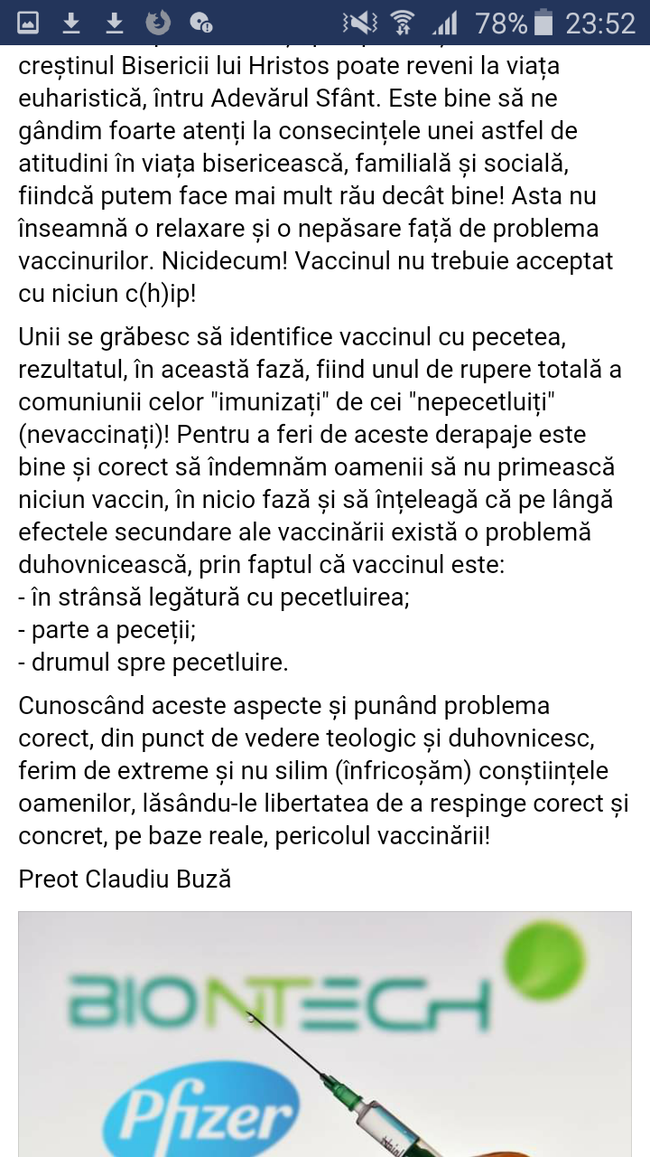 Aici prea ereticul teOLOG care NU A VAZUT HARUL sustine erezia ca ecumenistii constienti dati anathema de ROCOR is Orthodocsi adica gen Longhin ereticul care pomeneste pe rugatorul cu musulmani Onufrie, Serafim preavaccinatul666 deci ei zic pe fata ai pecetea in tine NU ESTI LEPADAT DESI AI SEMNAT PTR PRIMIREA VACCINUNULUI666 si da EI ZIC ASTA PTR CA DACA BUZA NU ERA DE ACORD i-ar fi sters comentariul, deci oamenilor ei va zic poti umbla cu pecetea666 in tine ca nu e LEPADARE poti sa te rogi cu ereticii ecumenistii si cu pentru ereticul Onifrie la Liturghie ca tu ramai orthodox(asta da inselare draceasca) pai mai nebunilor=eretici Buza si Mihai daca Maica Domnului a zis ca documentele actuale is o LEPADARE alea cu cip in ele ce or fi nu mai zicem de cipurile bagate prin vaccin in corp ptr ca se stia de dinainte din 2013 ca vor baga nano666 in vaccin si mai DAI SI SEMNATURA PTR ASTA , asta NU E LEPADARE??? inseamna ca voi sunteti SLUGILE SATANEI PE FATA! oare a baga celule de FETUSI avortati in corp nu e ritual satanic si Buza zice ca sa ii primeasca la impartasit dupa spovedanie :))) e nebun=eretic de legat cum ii poti da impartasanie cand el are nano666 in el si a SEMNAT ca accepta ?? Cum poti impartasi asa repede unu ce e spurcat cu fetusi de avortoni???? Claudiu Buza e din duhovnicii iadului te iei dupa el garantat 100% te duci in IAD CU EL DE MANA !